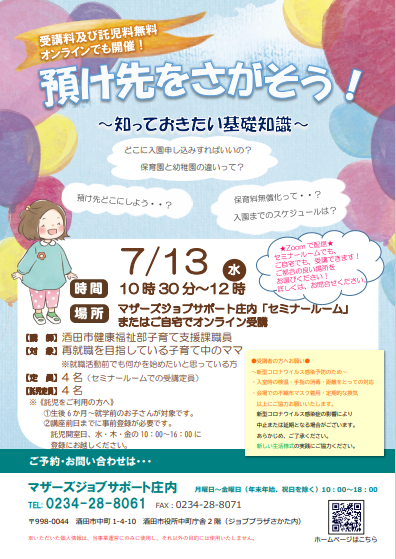 預け先をさがそう!〜知っておきたい基礎知識〜「そろそろ子どもを預けて仕事を始めようかな…」「預け先はどこにしたらいいんだろう?」 そんなママにおすすめのセミナーです。幼稚園や保育園の違い、預け先の探し方、申込み方法や入園までのスケジュールについて酒田市子育て支援課の職員の方からお話を聞くことができます。早めに情報をあつめて、仕事を始める準備をしてみませんか? 【日時】7月13日(水) 10:30〜12:00【対象】就職を目指している子育て中のママ ※就職活動前で何かを始めたい方でもOK 【会場】マザーズジョブサポート庄内 セミナールーム (酒田市中町1-4-10 酒田市役所中町庁舎2階) またはご自宅でオンライン受講(Zoom) 【受講料・託児料】無料 【定員】@セミナールームでの受講(4名) Aオンラインでの受講(随時受け付けております) ※@の場合は託児もご利用いただけます。【託児】定員 4名 ※事前登録・予約が必要です 保育ルーム開室日【水・木・金】の 10:00〜16:00に登録にお越し下さい。 ※併設の保育ルームで、保育スタッフが お子さんをお預かりします。 ママは安心して受講いただけます。★★セミナールームご利用の皆様へお願い★★〜新型コロナウイルス拡大防止のため〜・入室時の検温・手指の消毒・距離をとっての対応・会場での不織布マスク着用・定期的な換気以上にご協力お願いいたします。新型コロナウイルス感染症の影響により中止または延期となる場合がございます。あらかじめ、ご了承ください。新しい生活様式の実践にご協力ください。★−−−−−−−−−−−−−−−−−−−★●ご自宅でオンライン受講ご利用の方へ●・インターネット環境が必要になります 通信料は自己負担です・パソコン、スマートフォン、 タブレットをご準備いただき、 事前にZoom meetingを ダウンロードしてください・セミナー中はカメラをオンにし、 お顔のみえる状態で受講して下さい●ーーーーーーーーーーーーーーーーーー●【駐車場について】 お車でお越しの際は、中町庁舎脇にある セントラルホテル契約駐車場をご利用ください。(『ジョブプラザさかた』と表示してあります。) ※契約駐車場が満車の場合は、 酒田市中央地下駐車場をご利用ください。 地下駐車場をご利用の方は、 無料駐車券(最大2時間)を発行いたします。 お帰りの際にコンシェルジュ窓口へお声がけください。どうぞ、お気軽にお問い合わせくださいね。◇お申込み・お問い合わせ◇マザーズジョブサポート庄内TEL:0234-28-8061 メールでのお申込みはコチラ