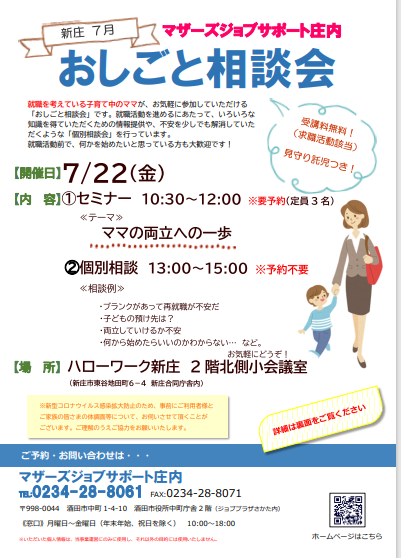 マザーズジョブサポート庄内おしごと相談会in新庄を開催します。 【開催日】7月22日(金)【開催場所】ハローワーク新庄 2階北側小会議室【内容】◎10:30〜12:00 セミナー 「ママの両立への一歩」 ※お申込みが必要です。 就職への心配や不安を一人で抱えていませんか? 家事はどうする? 子どもとのかかわり方は? 就職後をイメージしながら、今できる準備とは? など、一緒に考えてみませんか? ◎13:00〜15:00 個別相談会 ※どなたでもご利用いただけます お申込みは不要です。 ・おしごとに関するお悩み ・子育てに関すること ・仕事と家事、子育てとの両立 など、お気軽にご相談ください。 ♪お子さんと一緒に、お気軽にお越しください♪お子さんと同じお部屋でセミナーを受講し、相談することができます。保育スタッフが、ママをサポートします。 どうぞ、お気軽にお問い合わせくださいね。 ◇お申込み・お問い合わせ◇マザーズジョブサポート庄内TEL:0234-28-8061メールでのお申込みはコチラ
