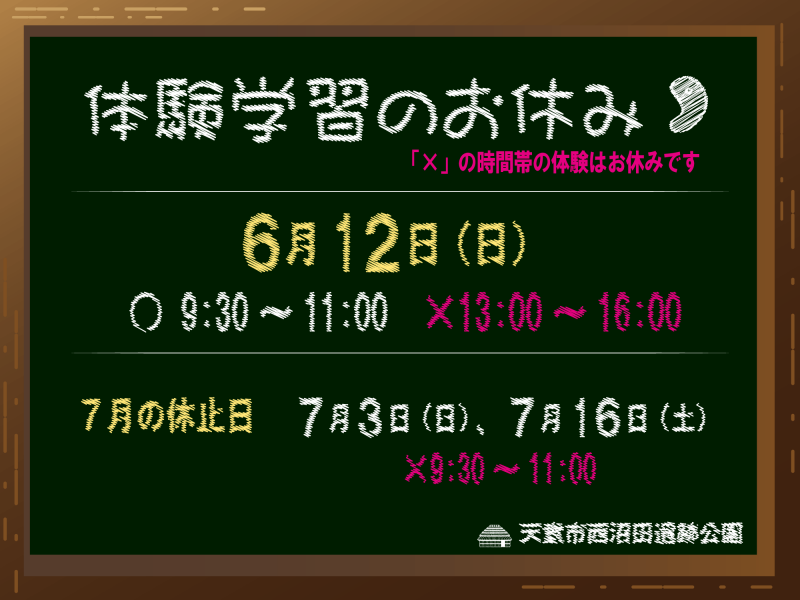 上記のとおり、体験学習を休止します。ご不便をおかけしますが、体験学習をご利用の方は受付時間をご確認の上ご来園くださいますようお願いします。