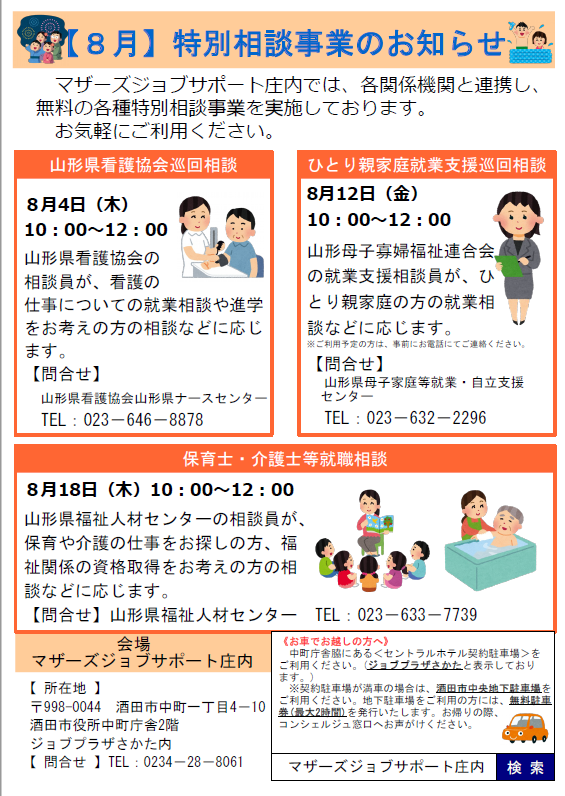 マザーズジョブサポート庄内では、各関係機関と連携し、各種特別相談事業を実施しております。ぜひ、ご利用ください。 山形県看護協会巡回相談 【要予約】日 時 8月4日(木)10:00〜12:00場 所 マザーズジョブサポート庄内 セミナールーム問合せ 山形県看護協会 пF023-646-8878HP:http://www.nurse-yamagata.or.jp/ 看護の仕事への復職をお考えの方、お気軽にご相談ください。 保育士・介護士等就職相談 ※お申し込み不要日 時 8月18日(木)10:00〜12:00場 所 マザーズジョブサポート庄内 セミナールーム問合せ 山形県福祉人材センター пF023-633-7739HP:http://www.ymgt-shakyo.or.jp/jinzai/保育士・介護士・看護師など資格をお持ちの方や、資格取得を目指している方、福祉職にご関心のある方は、お気軽にお越しください。 ひとり親家庭就業支援相談 [要予約]日 時 8月12日(金)10:00〜12:00場 所 マザーズジョブサポート庄内 セミナールーム問合せ 山形県母子家庭等就業・自立支援センター пF023-632-2296HP:http://www.y-boshi.com/self-support/※新型コロナウイルス感染症が急拡大しているため、 ひとり親家庭就業支援相談はオンラインで実施します。ひとり親家庭の方や今後について考えている方、どうぞお気軽にご相談ください。10:00〜11:00(予約済)11:00〜12:00(空きあり) ※各相談会について、利用ご希望の方は、マザーズジョブサポート庄内までお気軽にお声掛けください。※ご相談の際、お子さまの託児は『保育ルーム きらきら』をご利用いただけます。託児ルームのご利用には、事前のご登録が必要です。 【駐車場について】お車でお越しの際は、中町庁舎脇にあるセントラルホテル契約駐車場をご利用ください。(ジョブプラザさかたと表示してあります。)※契約駐車場が満車の場合は、酒田市中央地下駐車場をご利用ください。無料駐車券(最大2時間)を発行いたします。お帰りの際に、コンシェルジュ窓口へお声がけください。 ◇お申込み・お問い合わせ◇マザーズジョブサポート庄内TEL:0234-28-8061
