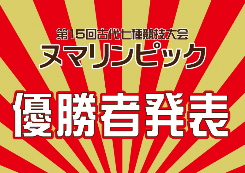 10月9日に開催された第15回ヌマリンピック古代七種競技大会の優勝者および、5種目参加者のプレゼント抽選当選者を発表します。受賞された方・当選された方には、賞品・記念品を授与いたします。10月15日(土)〜11月30日(水)の期間に、西沼田遺跡公園ぬまりん館へお越しください。 第15回大会 優勝者稲杭投げ 【部門】 【(エントリーajお名前】 【記録】大人の部 男性 (231)おおた じゅんさん 17m10p 〃 女性 (299)やまぐち ゆみさん 10m70p子どもの部 男性 (030)つちや らいきさん 10m42p 〃 女性 (073)やまのうち ゆあさん 11m20p 古代孔球 【部門】 【(エントリーajお名前】 【記録】大人の部 (296)はやし ひろしさん 25点 (333)たかの れなさん 25点子どもの部 (112)はやし きらさん 22点 弓名人【部門】 【(エントリーajお名前】 【記録】大人の部 (205)かわぐち たくまさん 50点子どもの部 (116)あいざわ りょうたろうさん 15点 たらばす投げ【部門】 【(エントリーajお名前】 【記録】大人の部 (232)とがし しゅういちさん 90点子どもの部 (003)いちかわ れおさん 80点 (037)もりや てんまさん 80点 (079)こんの るいさん 80点 丸太わたり【部門】 【(エントリーajお名前】 【記録】大人の部 (313)のぼるさん 15秒02子どもの部 (046)もりや りゅうせいさん 18秒02 ーーーーーーーーーーーーーーーーーーーーーーーーーーーーーーーーーーーーーーーー5種目参加者プレゼント抽選 当選者(20名)(004) ごとう はるひろさん (011)もいずみ ことさん (015)おぎはら かなこさん(021) いのうえ やまとさん (029)まつお ゆうかさん (034)やはぎ あきひとさん(066) いしかわ こたろうさん (071)すずき たけとさん (096)たきぐち まゆりさん(113) おおみや ふうこさん (210)ささ ゆきさん (218)さくらい ゆきひろさん(220) のがわ けんたさん (233)おおた あおいさん (253)なかの のぶこさん(265)こんた みきさん (275) たかはし さきおさん (286)うめつ てつおさん(289)さいとう かずのりさん (332)ひとつやなぎ しずかさん
