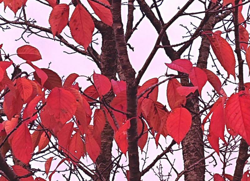 ●昨日から急に寒くなりました 道路わきの桜の葉が真っ赤になりました すっかり葉を落とした木もあり冬の装いのような感じがします