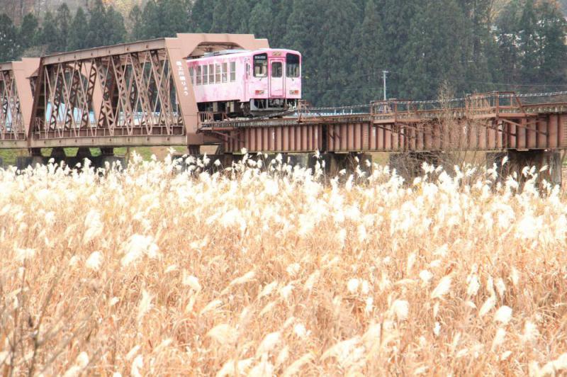 ●フラワー長井線をテーマに写真を撮り続けている市内宮内の加藤弘一氏の四季折々の写真は郷愁を誘うステキは写真が数多くあります 本人に了解をいただきススキの中を疾走するフラワー長井線を紹介します