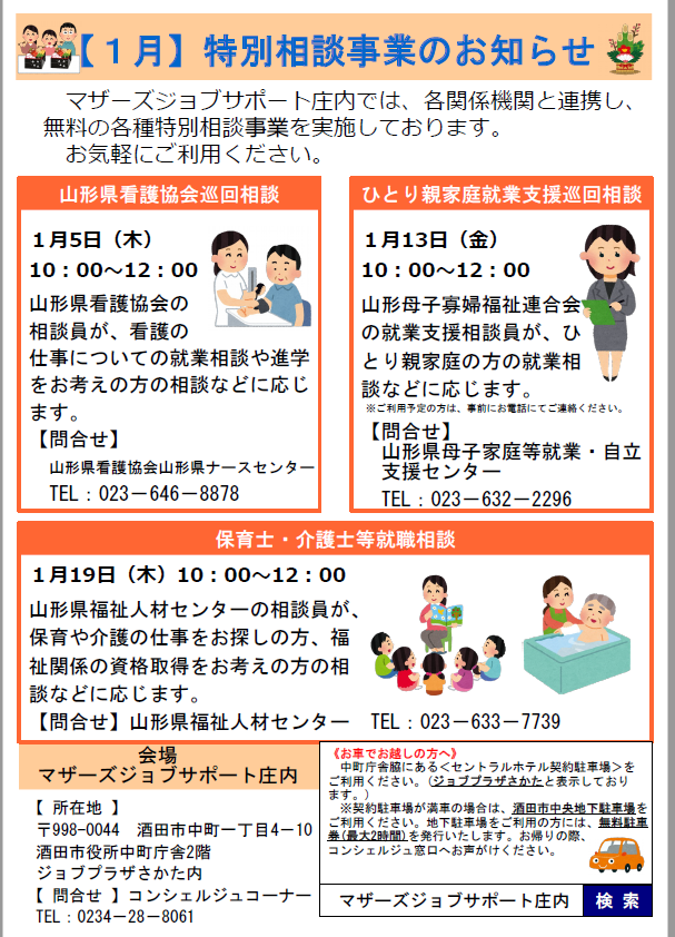 マザーズジョブサポート庄内では、各関係機関と連携し、各種特別相談事業を実施しております。ぜひ、ご利用ください。 山形県看護協会巡回相談 【要予約】日 時 1月5日(木)10:00〜12:00場 所 マザーズジョブサポート庄内 セミナールーム問合せ 山形県看護協会 пF023-646-8878HP:http://www.nurse-yamagata.or.jp/ 看護の仕事への復職をお考えの方、お気軽にご相談ください。 保育士・介護士等就職相談 ※お申し込み不要日 時 1月19日(木)10:00〜12:00場 所 マザーズジョブサポート庄内 セミナールーム問合せ 山形県福祉人材センター пF023-633-7739HP:http://www.ymgt-shakyo.or.jp/jinzai/保育士・介護士・看護師など資格をお持ちの方や、資格取得を目指している方、福祉職にご関心のある方は、お気軽にお越しください。 ひとり親家庭就業支援相談 [要予約]日 時 1月13日(金)10:00〜12:00場 所 マザーズジョブサポート庄内 セミナールーム問合せ 山形県母子家庭等就業・自立支援センター пF023-632-2296HP:http://www.y-boshi.com/self-support/ひとり親家庭の方や今後について考えている方、どうぞお気軽にご相談ください。 ※各相談会について、利用ご希望の方は、マザーズジョブサポート庄内までお気軽にお声掛けください。※ご相談の際、お子さまの託児は『保育ルーム きらきら』をご利用いただけます。託児ルームのご利用には、事前のご登録が必要です。 【駐車場について】お車でお越しの際は、中町庁舎脇にあるセントラルホテル契約駐車場をご利用ください。(ジョブプラザさかたと表示してあります。)※契約駐車場が満車の場合は、酒田市中央地下駐車場をご利用ください。無料駐車券(最大2時間)を発行いたします。お帰りの際に、コンシェルジュ窓口へお声がけください。 ◇お申込み・お問い合わせ◇マザーズジョブサポート庄内TEL:0234-28-8061メールでのお申込みはコチラ