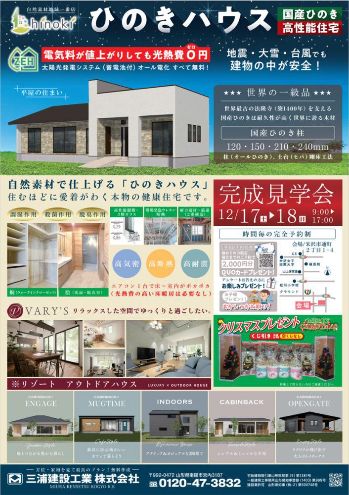 師走の候、ますます御健勝のこととお慶び申し上げます。今年も残すところ3週間となり、寒い時期となりましたが、皆様冬のご準備は万全でしょうか。さて、当社では12月の17日(土)18日(日)の2日間 『大雪でも積雪ゼロ!除雪費ゼロ!』真冬でも温かい「ひのきハウス健康住宅」の完成見学会を開催します。『ひのきハウス』は地震・台風・大雪に対しましても安全安心の構造ですので、ぜひこの機会にお確かめください。 会 場:米沢市通町2丁目1-4 開催日:12月17日(土)18日(日)の2日間 時 間:9:00〜17:00まで ※ 1時間単位の完全予約制 予約先 → TEL:0120-47-3832 Web予約 ↓ ↓ ↓ https://docs.google.com/forms/d/1hyBbNfz4d3BFnWpT4I6vx1g_JUwb8zIl6xb24NGljJM/viewform?edit_requested=true※Web予約して頂いた方への特典として 「2,000円分のQUOカードプレゼント!」※空くじなしのクリスマスプレゼントを準備しています。スタッフ一同、感染対策も万全にして、皆様のお越しをお待ちしております。