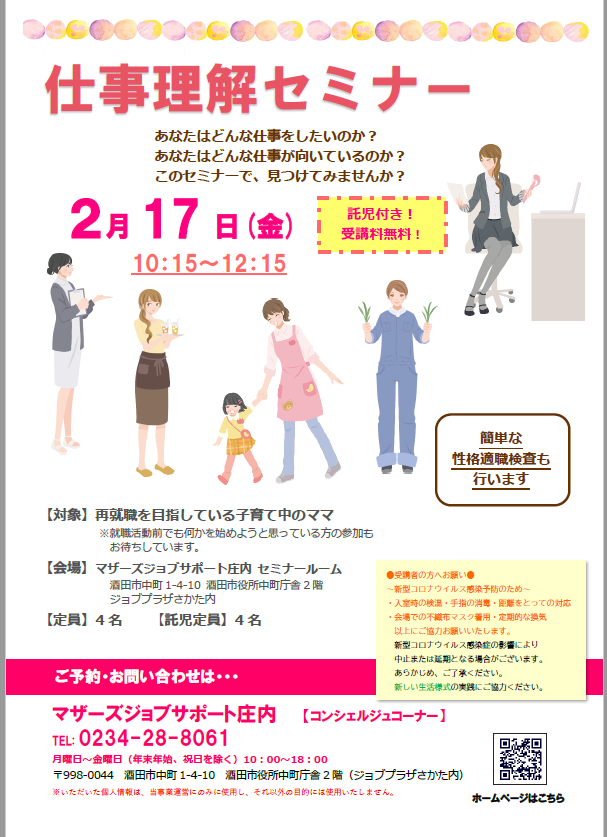 満員御礼!※お申し込みいただいた方、 ありがとうございました。 当日お待ちしております。※キャンセル待ちでの受付は 行っております。 マザーズジョブサポート庄内主催『仕事理解セミナー』のお知らせです。 自分はどんな仕事をしたいのか?どんな仕事が向いているんだろうか?こんな気持ちを持っている方にピッタリのセミナーです!就職状況や、いろいろな職業を知り、簡単な適職診断をやってみて自分の適性をさぐってみましょう。実務経験者のママの声を参考に、仕事内容、必要とされるスキル、やりがいの一例を紹介します! 【日 時】2月17日(金)10時15分〜12時15分 【対 象】就職を目指している子育て中のママ※就職活動前でも何かを始めたいと思っているママもOK 【会 場】マザーズジョブサポート庄内セミナールーム【受講料・託児料】無料【定 員】先着4名※お申込みが必要です。【託 児】定員4名※事前登録・予約が必要です。 保育ルーム開室日、水・木・金の 16:00までに登録にお越し下さい。※併設の保育ルームで、保育スタッフが お子さんをお預かりします。 ママは安心して受講いただけます。 ★★受講者の皆様へお願い★★新型コロナウイルス拡大防止のため、・入室時の検温・手指の消毒・距離をとっての対応・会場での不織布マスク着用・定期的な換気以上にご協力お願いいたします。新型コロナウイルス感染症の影響により中止または延期となる場合がございます。あらかじめ、ご了承ください。新しい生活様式の実践にご協力ください。★★ーーーーーーーーーーーーーーー★★ 【駐車場について】お車でお越しの際は、中町庁舎脇にあるセントラルホテル契約駐車場をご利用ください。(ジョブプラザさかたと表示してあります。)※契約駐車場が満車の場合は、酒田市中央地下駐車場をご利用ください。無料駐車券(最大2時間)を発行いたします。お帰りの際に、コンシェルジュ窓口へお声がけください。 ◇お申込み・お問い合わせ◇マザーズジョブサポート庄内TEL:0234-28-8061メールでのお申込みはコチラ