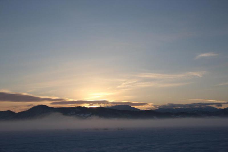 ●朝から眩しくなりそうに陽の光がさしこんでいます 朝日が昇る頃朝霧でしょうか山と地平線の間に立ち込めています 今年最後のお天気になるのでしょうか思わず写真を撮りました