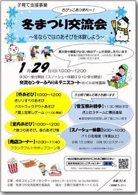 ※この事業は終了しました。ご参加ありがとうございました。 冬ならではの遊びを体験する冬まつり交流会を開催します。交流センターふらりの長井市テニスコートをメイン会場に行います。小学校低学年ぐらいまでのお子さんが楽しめる内容です。当日は雪あそびのできる格好で、ご家族でぜひご参加ください! い つ:令和5年1月29日(日) 午前10時〜12時(受付開始は9時30分から) ※スノーシュー体験は9時10分から受付します。 どこで:交流センターふらり(長井市屋城町6-53)※長井めぐみ幼稚園の隣です。 あそびのメニュー:【外あそび】ソリすべり、雪上宝探し 他【室内あそび】魚つりあそび 他【スノーシュー体験】9時30分〜10:30分(受付開始9時10分)【雪玉積み競争】11時30分開始 ※上位3チームに景品進呈【売店コーナー】 詳しくはこちらから(チラシ・PDF) ※感染症の拡大など、諸般の事情により中止になる場合があります。 ご来場の前に当ホームページでご確認ください。 主催:長井市中央コミュニティセンター(電話とFAX 0238-84-5869)主管:冬まつり交流会実行委員会 協力:子育て支援サポートくらぶ Instagramはこちら