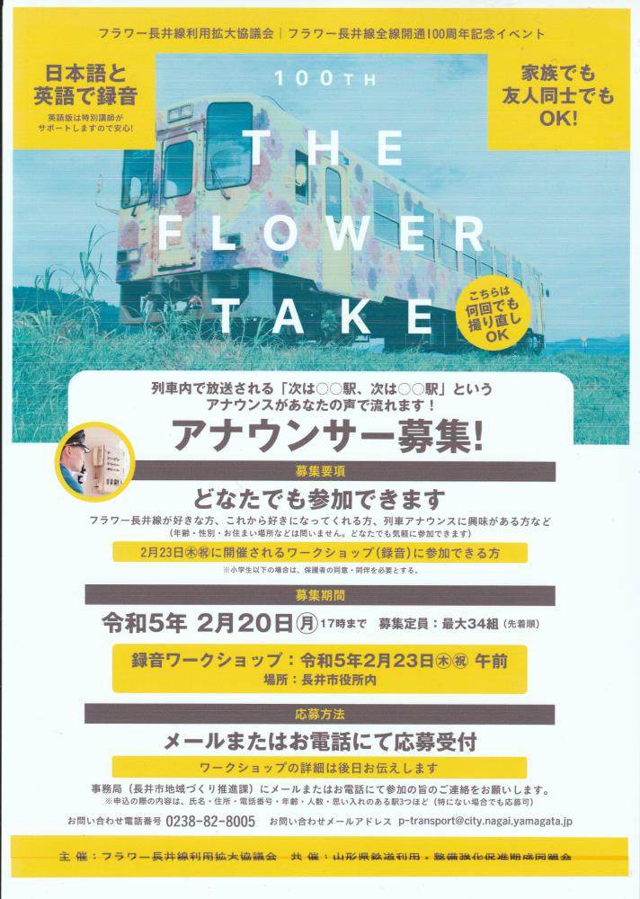 2023年4月22日、フラワー長井線は荒砥駅までの全線開通100周年を迎えます。山形鉄道や行政関係者で記念事業の準備を進めているようですが、この度、その第1弾が発表されました。それがこのチラシです。 列車内に流れる「次は○○駅、次は○○駅」というアナウンサーを募集するもので、開通記念日の4月22日から12月末まで車内で流す。駅名だけでなく、長井線への思いや応援メッセージも盛り込んでもらうとのことです。