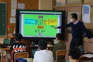 学習指導要領にはこうあります。「児童がプログラミングを体験しながら、コンピュータに意図した処理を行わせるために必要な論理的思考を身につけるための学習活動」。一人1台端末が貸与されており、学習の中でもタブレットPCを使いこなしています。”意図した処理”つまり、正しく、順序立てて指示を出すことができるようにです。一つのことを教えてもらうと、児童はこんな風に動かしたい、次はこうしたい、そのためにはどうしたらいいのかなと考えを転換し、進め、深めています。「これ、どうやっとできた?」この教え合いによる情報伝達のスピードは本当に早いです。社会、音楽、算数、理科等いろんな強化と結びつけて教えてくださいます。情報教育専門員の先生の授業を子供たちは楽しみにしています。