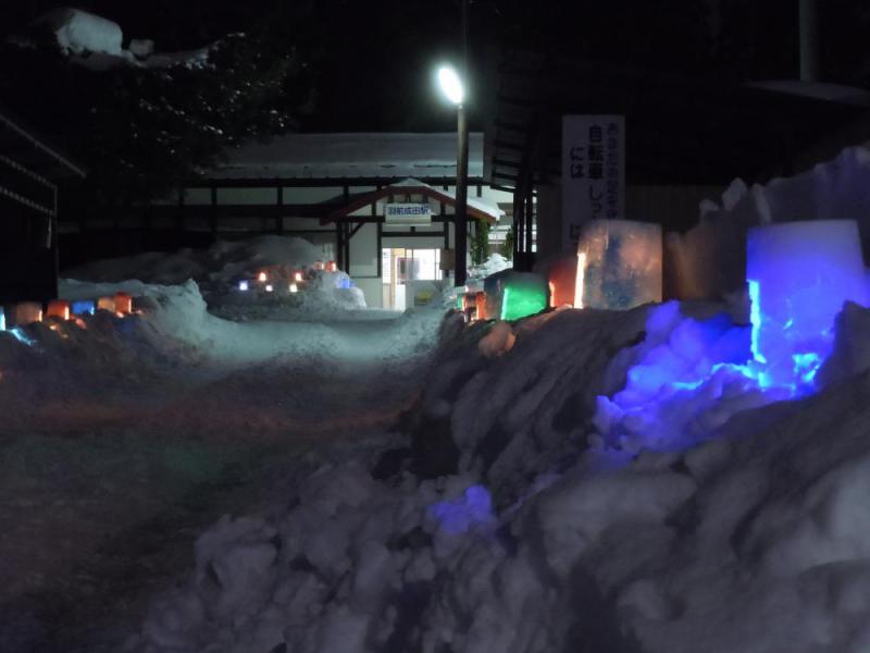 2023年2月4日、長井市の市街地で第20回雪灯り回廊祭りが開催された。この祭りが初めて開催された2000年初頭はデフレ不況に見舞われ、失業率も高い状況が続いていた時期である。長井の町もその例外ではなかった。そんな時に「街を元気にすんべ」という若い人の発案で開催されたのが始まりである。 おらだの会では発足後間もなくからイルミネーションを点灯させていたが、その後、駅前通りで雪灯り回廊祭りを実施していた。当時の宮崎会長が、吉川病院の患者さんを元気づけたいとの思いで、病院の職員と共に作業をやったこともある。宮崎会長の没後、平成29年2月からは実施せずに、その代わりに列車での参拝と新年会を行うようになった。 任意の自主団体が存続していくことはそれだけで大変なものがある。事業ができなくなることは残念なことではあるが、時代の変化の中で事業が変更されることも有りうることである。ただ、「地域を元気にすんべ」「楽しくやんべ」という気持ちだけは持ち続けたいものだ。 2013年の雪灯りの様子はこちらからどうぞ → ’13 成田駅前雪灯り回廊祭り@:山形鉄道 おらだの会 (samidare.jp)