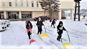 今朝は除雪車が道路に出ないぐらいの積雪。除雪出動の基準にまで達しない降雪ということでしょうか。でも玄関前、体育館からの非常口、駐車場には結構な雪が積もっています。私たちが雪かきをしていると、続々とお助け雪かきボランティア隊の児童の皆さんが駆け付けました。小さい体で大きなスノーダンプを使ってたくさんの雪を片付けていきます。非常口をほぼ一人できれいにする5年生、それに気づいて駆けつける4年生、スコップで来客用駐車場のアスファルトが見えるまで丁寧に雪はがしをする2年生、わきに固まった雪をスコップで運び、それをスノーダンプで受け取る2年生のコンビネーションの良さと出来栄えは職人技のようです。昨日は致芳っ子見守り隊の皆さんへ交通安全見守りの感謝の会を行いました。雪かき隊感謝の会も開きたいぐらいです。「ああ、1時間目が終わったぐらいだ。手首が疲れるねえ」「そうだね、帰りたいぐらいだね」「えっ!帰っていいんですか?」「ぐらいだね、だからね。授業も大事ですよ。」一緒に作業した職員からもたくさんたくさんほめてもらいました。担任の先生にも伝えるから、いっぱい褒めてもらいましょう。本当に助かった、ありがとう。学校だよりもアップしました。上記PDFダウンロードをクリックしてご覧ください。