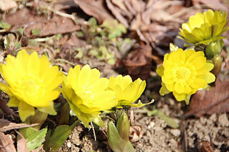 ●南陽市にも春が届きました つぼみを紹介しましたが良い天気に誘われて福寿草を見に出かけました 多くの花が咲き黄色の花にはハチが飛んでいます 私にとっての赤湯の春一番です