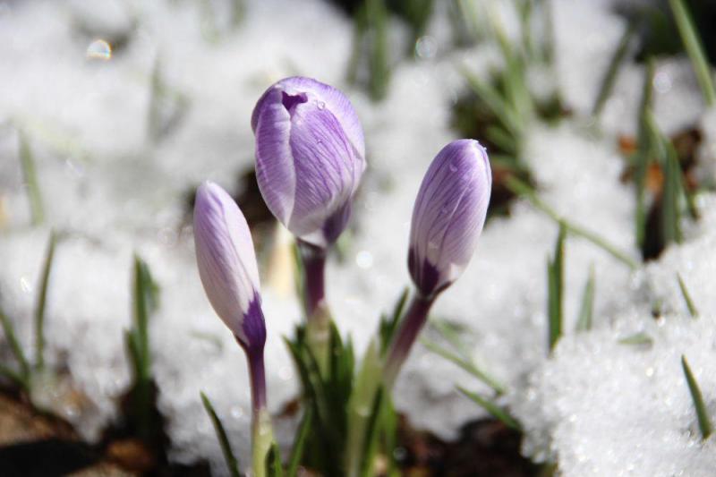 ●昨日の雪がうそのように晴れて真っ青な青空が一面に広がっています 昨日の雪がのこっており咲き始めた紫色のクロッカスが寒そうに咲いています もう雪はこれで終わりでしょうか