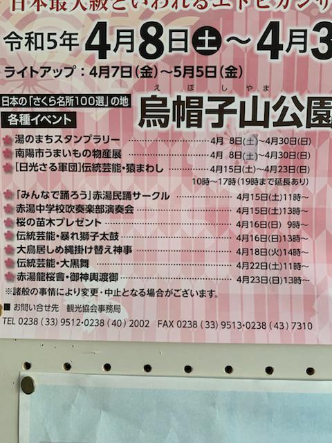先日「赤湯温泉桜まつり期間中のイベント情報が欲しい」とのお電話を頂戴しました。赤湯公民館で簡易なチラシを作成し、事務室前の情報コーナーに設置いたしました。期間中はえくぼプラザの駐車場も混雑が予想されます。お出かけの際はどうぞお気をつけ下さい。※写真はポスターの一部です。
