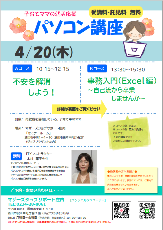 ☆マザーズジョブサポート庄内主催☆ 就活応援『パソコン講座』のお知らせ 満員御礼! A・Bコース※お申し込みいただいた方、 ありがとうございました。 当日お待ちしております。※キャンセル待ちでの受付は 行っております。 ≪Aコース≫ 4月20日(木)10:15〜12:15『不安を解消しよう!』「求人票の"パソコンが使える方"ってどの程度?」「仕事では、どのくらいのスキルが求められるの?」「WordとExcelって、どの程度使えると大丈夫?」などいろいろな不安がありますよね… パソコンについての"これから"を考えるきっかけに♪ ≪Bコース≫4月20日(木)13:30〜15:30『事務入門(Excel編) 〜自己流から卒業しませんか』事務のお仕事にも、一般・経理・労務など様々です。それぞれどのようなパソコン作業があるのかを確認していきます。実際にエクセルで、関数を利用し請求書を作成します。 ♪片方のコースのみ、両方のコース、どちらの受講でも可能です♪【対 象】就職を目指している子育て中のママ※就職活動前で何かを始めたいママもOK【会 場】マザーズジョブサポート庄内 セミナールーム【料 金】受講料 及び 託児料 無料【託 児】 ※事前登録・予約が必要です。保育ルーム開室日【水・木・金】の 10:00〜16:00に登録にお越し下さい。 ※併設の保育ルームで、保育スタッフが お子さんをお預かりします。 ママは安心して受講いただけます。 【駐車場について】お車でお越しの際は、中町庁舎脇にあるセントラルホテル契約駐車場をご利用ください。(ジョブプラザさかたと表示してあります。)※契約駐車場が満車の場合は、酒田市中央地下駐車場をご利用ください。無料駐車券(最大2時間)を発行いたします。お帰りの際に、コンシェルジュ窓口へお声がけください。 ★★受講者の皆様へお願い★★場合によっては、体調の確認をさせていただくことがございます。状況によっては、ご案内の変更をさせていただきます。あらかじめご了承ください。★★ーーーーーーーーーーーー★★どうぞ、お気軽にお問い合わせくださいね。 ◇お申込み・お問い合わせ◇マザーズジョブサポート庄内TEL:0234-28-8061メールでのお申込みはコチラ