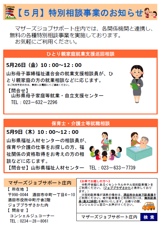 マザーズジョブサポート庄内では、各関係機関と連携し、各種特別相談事業を実施しております。ぜひ、ご利用ください。 保育士・介護士等就職相談 ※お申し込み不要日 時 5月9日(火)10:00〜12:00場 所 マザーズジョブサポート庄内 セミナールーム問合せ 山形県福祉人材センター пF023-633-7739HP:http://www.ymgt-shakyo.or.jp/jinzai/保育士・介護士・看護師など資格をお持ちの方や、資格取得を目指している方、福祉職にご関心のある方は、お気軽にお越しください。 ひとり親家庭就業支援相談 [要予約]日 時 5月26日(金)10:00〜12:00場 所 マザーズジョブサポート庄内 セミナールーム問合せ 山形県母子家庭等就業・自立支援センター пF023-632-2296HP:http://www.y-boshi.com/self-support/ひとり親家庭の方や今後について考えている方、どうぞお気軽にご相談ください。 ※各相談会について、利用ご希望の方は、マザーズジョブサポート庄内までお気軽にお声掛けください。※ご相談の際、お子さまの託児は『保育ルーム きらきら』をご利用いただけます。託児ルームのご利用には、事前のご登録が必要です。〇火曜日の託児ご利用については5月2日(火)午前までに お申し出ください。 【駐車場について】お車でお越しの際は、中町庁舎脇にあるセントラルホテル契約駐車場をご利用ください。(ジョブプラザさかたと表示してあります。)※契約駐車場が満車の場合は、酒田市中央地下駐車場をご利用ください。無料駐車券(最大2時間)を発行いたします。お帰りの際に、コンシェルジュ窓口へお声がけください。 ◇お申込み・お問い合わせ◇マザーズジョブサポート庄内TEL:0234-28-8061メールでのお申込みはコチラ