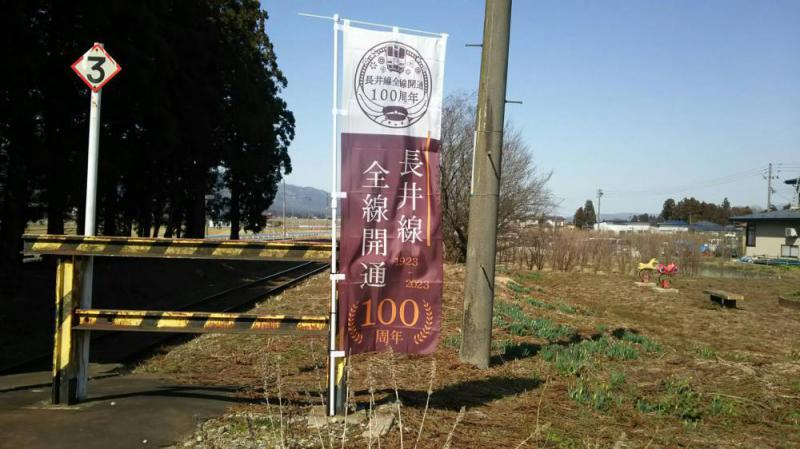4月22日の長井線全線開業100周年に向けて、長井線の全駅に記念の幟(のぼり)旗が掲揚されている。旗は2種類あって、写真の渋い感じの色合いのものと明るいものがある。さて1か月後にはどんなイベントが準備されているのだろうか、楽しみにしたいものです。 それにしてもその1年前の4月23日に左沢線が全線開通し、4月22日に長井線が荒砥まで開通している。当時の人たちにとっては、「次は左荒線だ!」と盛り上がったことでしょう。おらだの会のブログで、長井線の建設に係る歴史をまとめていましたが、この機会に改めて長井線の建設にかけた先人の思いを確認してみたいものです。 → 軽鉄人物伝:山形鉄道おらだの会 (samidare.jp)