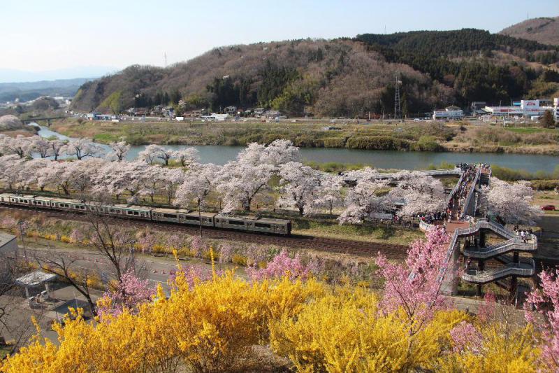 ●柴田町の船岡城址公園も桜や梅、レンギョウなどが咲き誇り多くの人で賑わっていました 展望台からみる東北本線と白石川岸の桜 そして列車と最高の花見となりました