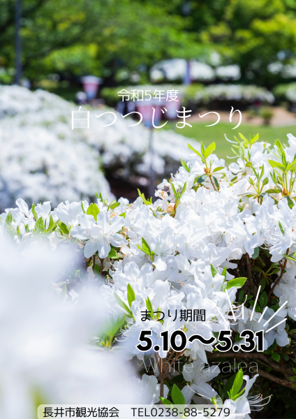 令和5年度ながい「白つつじまつり」開催のお知らせ今年も5月10日(水)〜5月31日(水)の期間中、白つつじまつりが開催されます!詳しい内容や催し物は後日、「白つつじまつり/黒獅子まつり」のイベントチラシにてお知らせ致します!チラシは5月1日に市報配布予定!※郵送にてチラシ発送も可能です!お気軽にお声がけください!園内全体に咲き誇る、真っ白な雪化粧をしたかのような圧巻の白つつじをどうぞご覧ください! ☆.。.:*・°☆.。.:*・°☆.。.:*・°☆☆.。.:*・°☆.。.:*・°☆.。.:*・°☆見頃予想や最新状況などは、随時こちらの「長井市ポータルサイト」でお知らせします!是非チェックして下さいね!!白つつじまつりのリーフレットや長井市の観光パンフレットの送付も行っております。ご希望の方はこちらからお気軽にお問い合わせください! 【長井市観光協会 公式アカウント】長井市観光協会ではFacebook・Instagramのアカウントを作成しております。桜、白つつじ、あやめの開花状況をお知らせする他、イベントの情報発信を行う予定です。是非お目通しくださいませ(*^ω^*)!!FacebookInstagram☆.。.:*・°☆.。.:*・°☆.。.:*・°☆☆.。.:*・°☆.。.:*・°☆.。.:*・°☆