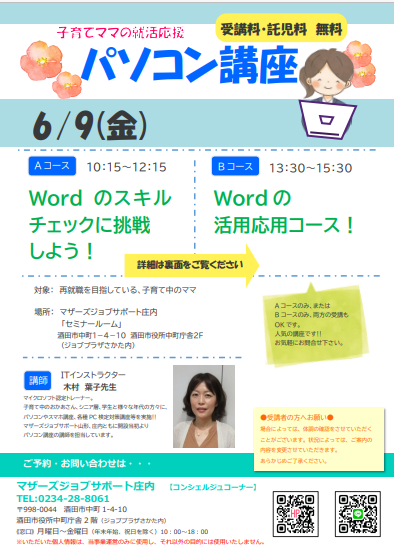 ☆マザーズジョブサポート庄内主催☆再就職応援『パソコン講座』のお知らせ ◇6月◇≪Aコース≫ 6月9日(金)10:15〜12:15『Wordのスキルチェックに挑戦しよう!』自信を持って「Word使えます!」と言えますか?講師と一緒に問題形式で基本操作、実務で役立つWordのスキルチェックに挑戦しましょう。次に、資料作成を体験しながらスキルチェックし、さらにWordの理解を深めましょう。自分がどのくらいWordを理解しているかを確認して、スキルアップに役立てましょう。 ≪Bコース≫ 6月9日(金)13:30〜15:30『Wordの活用応用コース!』Wordを使った宛名印刷の方法を知っていますか?宛名印刷の種類と必要なもの、住所録作成の注意点などを確認しましょう。住所録やWord文章を活用し、「文章を短時間で仕上げる」コツを学びましょう!この機会に是非マスターしましょう。 ♪片方のコースのみ、両方のコース、どちらの受講でも可能です♪ 【対 象】就職を目指している子育て中のママ※就職活動前で何かを始めたい方でもOK【会 場】マザーズジョブサポート庄内 セミナールーム【料 金】受講料 及び 託児料 無料【託 児】※事前登録・予約が必要です。 保育ルーム開室日【水・木・金】の 10:00〜16:00に登録にお越し下さい。 ※併設の保育ルームで、保育スタッフが お子さんをお預かりします。 ママは安心して受講いただけます。 【駐車場について】お車でお越しの際は、中町庁舎脇にあるセントラルホテル契約駐車場をご利用ください。(ジョブプラザさかたと表示してあります。)※契約駐車場が満車の場合は、酒田市中央地下駐車場をご利用ください。無料駐車券(最大2時間)を発行いたします。お帰りの際に、コンシェルジュ窓口へお声がけください。 ★★受講者の皆様へお願い★★場合によっては、体調の確認をさせていただくことがございます。状況によっては、ご案内の変更をさせていただきます。あらかじめご了承ください。★★ーーーーーーーーーーーー★★どうぞ、お気軽にお問い合わせくださいね。 ◇お申込み・お問い合わせ◇マザーズジョブサポート庄内TEL:0234-28-8061メールでのお申込みはコチラ