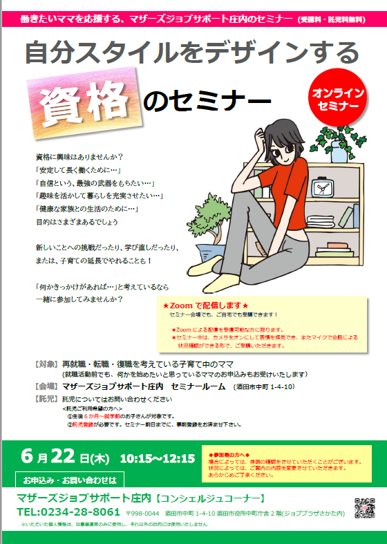 ☆マザーズジョブサポート庄内主催☆『自分のスタイルをデザインする 資格のセミナー』のお知らせです。資格に興味はありませんか?「安定して長く働くために…」「自身という、最強の武器をもちたい…」「趣味を活かして暮らしを充実させたい…」「健康な家族との生活のために…」目的はさまざまあるでしょう。新しいことへの挑戦だったり、学び直しだったり、または、子育ての延長でやれることも!「何かきっかけがあれば…」と考えているなら一緒に参加してみませんか? ★★受講者の皆様へお願い★★場合によっては、体調の確認をさせていただくことがございます。状況によっては、ご案内の変更をさせていただきます。あらかじめご了承ください。★★ーーーーーーーーーーーー★★●ご自宅でオンライン受講ご利用の方へ●・インターネット環境が必要になります。 通信料は自己負担です。・パソコン、スマートフォン、 またはたタブレットをご準備いただき、 事前にZoom meetingを ダウンロードしてください。・セミナー中はカメラをオンにし、 お顔の見える状態で受講して下さい。●●ーーーーーーーーーーーーーーーー●●【日 時】6月22日(水)10時15分〜12時15分 【対 象】就職を目指している子育て中のママ※就職活動前で何かを始めたい方でもOK【会 場】マザーズジョブサポート庄内 セミナールームまたは ご自宅でオンライン受講(Zoom)【料 金】受講料 及び 託児料 無料【託 児】ご利用希望の方はお問合せください。保育ルーム開室日【水・木・金】の 10:00〜16:00に登録が必要となります。 ※併設の保育ルームで、保育スタッフが お子さんをお預かりします。 ママは安心して受講いただけます。 【駐車場について】お車でお越しの際は、中町庁舎脇にある〈セントラルホテル契約駐車場〉をご利用ください。(ジョブプラザさかたと表示してあります。)※契約駐車場が満車の場合は、酒田市中央地下駐車場をご利用ください。無料駐車券(最大2時間)を発行いたします。 どうぞ、お気軽にお問い合わせくださいね。 ◇お申込み・お問い合わせ◇マザーズジョブサポート庄内TEL:0234-28-8061メールでのお申込みはコチラ