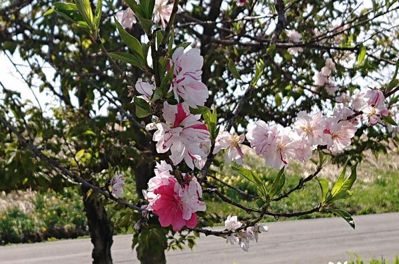 ●今朝はあいにくの雨降りです 夏日の昨日散歩道で見つけた赤と白のまだらの花が日差しに暑そうに咲いていました モモの花でしょうか 春から夏に向けての花が咲き始めています
