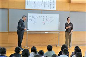 今日の朝会は校長の話。算数・数学にまつわる話をしてみました。『海王星の発見 実は数学の力で!』1846年 純粋に論理的な計算の結果に基づいて、現実に存在するものが発見された。「数学の真の力」が明らかになった。1840年代、その60年前に発見された天王星(英語名Uranus)が太陽から最も遠い惑星だとされていた。ところがその巨大な軌道が(天王星は84年で1周)ニュートンの重力の法則から一致していない。どうやら他にも未発見の天体があり、それが天王星を引っ張って軌道を乱しているらしい。数学を使ってその問題を解き、天王星の軌道に影響を及ぼしている小さな力にもとづいてもう一つの惑星の位置を突き止め、天文学者に送った。その後数時間のうちにその惑星を望遠鏡でとらえた。この8番目の惑星は大海原のような色をしていたことから、海の神にちなんで海王星(英語名 Neptuneネプチューン) と命名された。もう一つ、「ああ、日本でよかった」という話。ALTのニコさんはフランス生まれアメリカ育ち。手伝ってもらってフランスの数字の読み方について話をしました。80をフランスではクワトロ・ヴァンつまり4×20と読む。なんてややこしい。99はクワトロ・ヴァン・ディズ・ヌフこれは4×20+19。なんて難しい。ああ、日本でよかった。でもニコさんは日本の数え方で苦労している。鉛筆などは1ぽん、2ほん、3ぼん。同じ本なのに読み方が違う!why? Japanese people! と思っているかも。ちょっと難しい話なのに最後までよく聞いていてすばらしいと思いました。ありがとう!