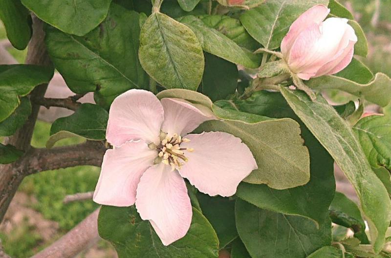 ●今日は昨日までうって変わって雨模様です 散歩途中で「カリン」の花をみつけました リンゴやサクランボよりは大きく薄紅色の花を咲かせています 秋には香りの良い大きな果実つけます 葉つきはあまり密ではなく緑陰を楽しむ樹種ではありませんが樹皮・新緑・紅葉が非常に美しいため家庭果樹として最適だそうです