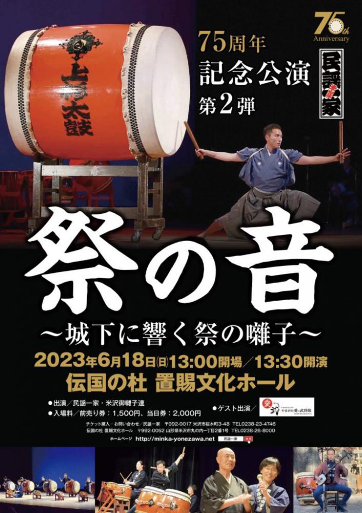 2023年6月18日(日)、伝国の杜置賜文化ホールにて民謡一家75周年記念公演第2弾「祭の音」が開催されます。城下に響く祭の囃子をぜひ聞きにお越しください!お待ちしております! 【開催日時】2023年6月18日(日) 13:00開場/13:30開演 【開催場所】伝国の杜 置賜文化ホール 【出 演】 民謡一家・米沢御囃子連ゲスト出演・やまがた愛の武将隊 【入場料】前売券:1,500円、当日券:2,000円 【チケット購入・お問い合わせ】民謡一家〒992-0017 山形県米沢市桜木町3-48TEL:0238-23-4746伝国の杜置賜文化ホール〒992-0052 山形県米沢市丸の内1丁目2-1TEL:0238-26-8000 ※詳しくは民謡一家HPをご覧ください。