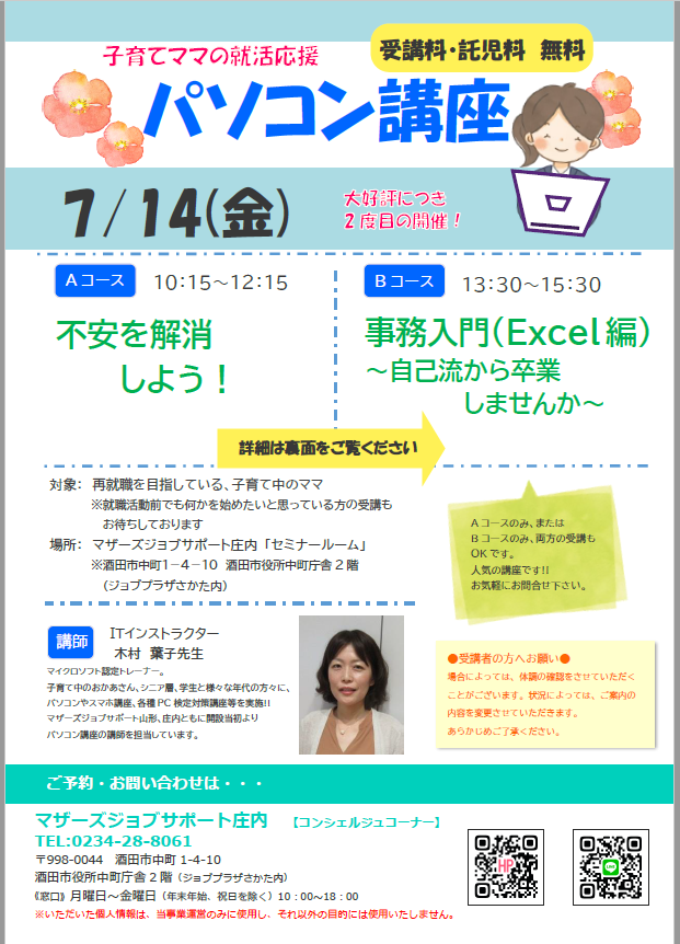 ☆マザーズジョブサポート庄内主催☆ 就活応援『パソコン講座』のお知らせ≪Aコース≫ 7月14日(金)10:15〜12:15『不安を解消しよう!』「求人票の"パソコンが使える方"ってどの程度?」「仕事では、どのくらいのスキルが求められるの?」「WordとExcelって、どの程度使えると大丈夫?」などいろいろな不安がありますよね… パソコンについての"これから"を考えるきっかけに♪ ≪Bコース≫7月14日(金)13:30〜15:30『事務入門(Excel編) 〜自己流から卒業しませんか』事務のお仕事にも、一般・経理・労務など様々です。それぞれどのようなパソコン作業があるのかを確認していきます。実際にエクセルで、関数を利用し請求書を作成します。 ♪片方のコースのみ、両方のコース、どちらの受講でも可能です♪【対 象】就職を目指している子育て中のママ※就職活動前で何かを始めたいママもOK【会 場】マザーズジョブサポート庄内 セミナールーム【料 金】受講料 及び 託児料 無料【託 児】 ※事前登録・予約が必要です。保育ルーム開室日【水・木・金】の 10:00〜16:00に登録にお越し下さい。 ※併設の保育ルームで、保育スタッフが お子さんをお預かりします。 ママは安心して受講いただけます。 【駐車場について】お車でお越しの際は、中町庁舎脇にあるセントラルホテル契約駐車場をご利用ください。(ジョブプラザさかたと表示してあります。)※契約駐車場が満車の場合は、酒田市中央地下駐車場をご利用ください。無料駐車券(最大2時間)を発行いたします。お帰りの際に、コンシェルジュ窓口へお声がけください。 ★★受講者の皆様へお願い★★場合によっては、体調の確認をさせていただくことがございます。状況によっては、ご案内の変更をさせていただきます。あらかじめご了承ください。★★ーーーーーーーーーーーー★★どうぞ、お気軽にお問い合わせくださいね。 ◇お申込み・お問い合わせ◇マザーズジョブサポート庄内TEL:0234-28-8061メールでのお申込みはコチラ