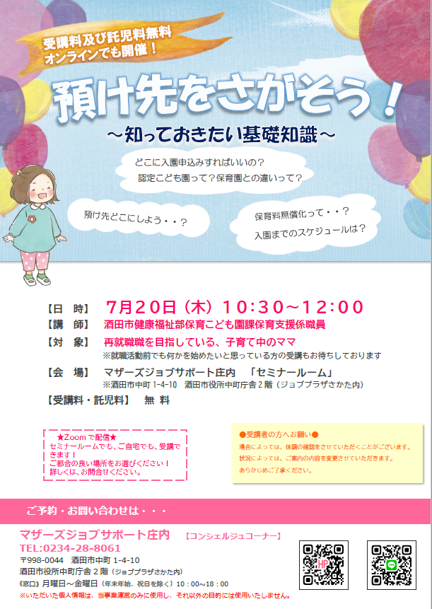 預け先をさがそう!〜知っておきたい基礎知識〜「そろそろ子どもを預けて仕事を始めようかな…」「預け先はどこにしたらいいんだろう?」 そんなママにおすすめのセミナーです。幼稚園や保育園の違い、預け先の探し方、申込み方法や入園までのスケジュールについて酒田市子育て支援課の職員の方からお話を聞くことができます。早めに情報をあつめて、仕事を始める準備をしてみませんか? 【日時】7月20日(木)10:30〜12:00【対象】就職を目指している子育て中のママ※就職活動前で何かを始めたい方でもOK 【会場】マザーズジョブサポート庄内 セミナールーム (酒田市中町1-4-10 酒田市役所中町庁舎2階) またはご自宅でオンライン受講(Zoom) 【料金】受講料 及び 託児料 無料 【定員】@セミナールームでの受講Aオンラインでの受講(随時受け付けております)※@の場合は託児もご利用いただけます。【託児】 ※事前登録・予約が必要です 保育ルーム開室日【水・木・金】の10:00〜16:00に登録にお越し下さい。 ※併設の保育ルームで、保育スタッフが お子さんをお預かりします。 ママは安心して受講いただけます。 ★★受講者の皆様へお願い★★場合によっては、体調の確認をさせていただくことがございます。状況によっては、ご案内の変更をさせていただきます。あらかじめご了承ください。★★ーーーーーーーーーーーー★★【駐車場について】 お車でお越しの際は、中町庁舎脇にある セントラルホテル契約駐車場をご利用ください。(『ジョブプラザさかた』と表示してあります。) ※契約駐車場が満車の場合は、 酒田市中央地下駐車場をご利用ください。 地下駐車場をご利用の方は、 無料駐車券(最大2時間)を発行いたします。 お帰りの際にコンシェルジュ窓口へお声がけください。どうぞ、お気軽にお問い合わせくださいね。◇お申込み・お問い合わせ◇マザーズジョブサポート庄内TEL:0234-28-8061メールでのお申込みはコチラ