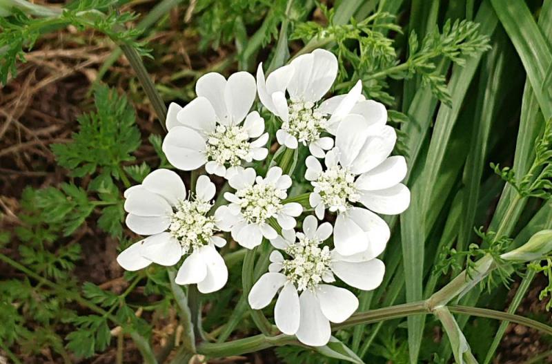 ●「オルレア」の白い花が気持ちよさそうに道ばたの畑で風に揺らいでいます 本には「オルヤラ」との名前で紹介されています まるでレースのような花姿が印象的なオルレア花でとても人気のある花だそうですが知りませんでした 色鮮やかな花の中に白いアクセントがあるといいですね 「オルレア」は種からでも育てらるので初心者の方にもおすすめの植物だそうです 繁殖力も旺盛で寒さにこの辺では育てやすいのではと説明されています