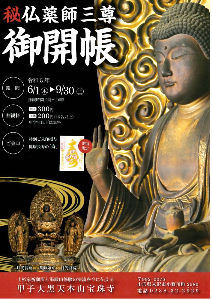 ◆◆◆秘仏薬師三尊 御開帳◆◆◆西川町大井沢にあった湯殿山四ヶ寺のひとつ大日寺より遷座された薬師三尊の初めてのご開帳です。薬師如来は左手に薬壺を持っているのが特徴で、人々の病苦や災難を除くとされます。左右には日光菩薩と月光菩薩を配する三尊形式の仏像です。この尊い御縁にご参拝いただき、皆様の無病息災を祈念ください。 【期 間】令和5年6月1日(木)〜9月30日(土) 拝観時間:9時〜16時※拝観希望者は受付所にお越しください。 【場 所】甲子大黒天本山宝珠寺 山形県米沢市小野川町2580 【拝観料】個人:300円 団体:200円(15名以上) ※中学生以下は無料 【ご朱印】特別ご朱印授与(期間限定) 健康長寿、金の「寿」 ◆◆◆夜間特別拝観「慈悲のあかり回廊」◆◆◆【日 程】7/15(土)・7/16(日)・7/29(土)・7/30(日) 8/5(土)・8/6(日)・8/19(土)・8/20(日) 9/2(土)・9/3(日)・9/16(土)・9/17(日)・9/30(土)※拝観時間 19時〜21時 【料 金】 個人500円/団体300円/中学生まで無料 【ご朱印】特別ご朱印授与(夜間拝観限定) 健康長寿、銀の「寿」 【お問い合わせ】甲子大黒天本山宝珠寺〒992-0076山形県米沢市小野川町2580TEL:0238-32-2929 ※詳しくは甲子大黒天ホームページをご覧ください。
