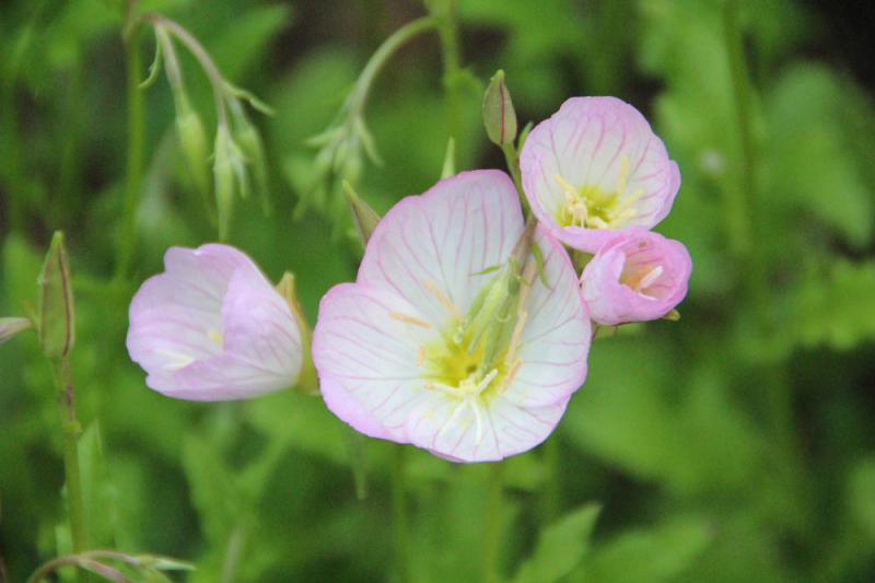 ●「ヒルザキツキミソウ」が淡いピンクの縁どりをした花を咲かせています 漢字では「昼咲月見草」と書きます 月見草とは夜に花を咲かせる植物のことだろうと思いますが ヒルザキツキミソウなどのマツヨイグサの仲間は夕方から夜にかけて咲くものが多く誤って月見草と呼ばれるようになりマツヨイグサの仲間であるこの草花にも「ツキミソウ」の名がつき 実際には昼に花が咲くため「ヒルザキツキミソウ」という矛盾した名前がついたとのことです 知人からいただきましたが繁殖力が旺盛であっという間に増えてしまいました