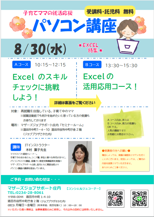 ☆マザーズジョブサポート庄内主催☆再就職応援『パソコン講座』のお知らせ ≪Aコース≫ 8月30日(水)10:15〜12:15『Excelのスキルチェックに挑戦しよう!』Excelの基本操作、実務で役立つ内容を問題にして指示された操作ができるかチェックします。解説を聞きながら操作をして理解を深めましょう! ≪Bコース≫ 8月30日(水)13:30〜15:30『Excelの活用応用コース!』「見やすい表を手早く作る」コツを学びます。実務を意識して、請求書の作り方や書類の管理のし仕方で役立つ情報も学べます。知っているだけで毎日の業務が変わる仕事ワザをマスターしましょう。 ♪片方のコースのみ、両方のコース、どちらの受講でも可能です♪【対 象】就職を目指している子育て中のママ※就職活動前で何かを始めたいママもOK【会 場】マザーズジョブサポート庄内 セミナールーム【料 金】受講料 及び 託児料 無料【託 児】 ※事前登録・予約が必要です。保育ルーム開室日【水・木・金】の 10:00〜16:00に登録にお越し下さい。 ※併設の保育ルームで、保育スタッフが お子さんをお預かりします。 ママは安心して受講いただけます。 【駐車場について】お車でお越しの際は、中町庁舎脇にあるセントラルホテル契約駐車場をご利用ください。(ジョブプラザさかたと表示してあります。)※契約駐車場が満車の場合は、酒田市中央地下駐車場をご利用ください。無料駐車券(最大2時間)を発行いたします。お帰りの際に、コンシェルジュ窓口へお声がけください。 ★★受講者の皆様へお願い★★場合によっては、体調の確認をさせていただくことがございます。状況によっては、ご案内の変更をさせていただきます。あらかじめご了承ください。★★ーーーーーーーーーーーー★★どうぞ、お気軽にお問い合わせくださいね。 ◇お申込み・お問い合わせ◇マザーズジョブサポート庄内TEL:0234-28-8061メールでのお申込みはコチラ