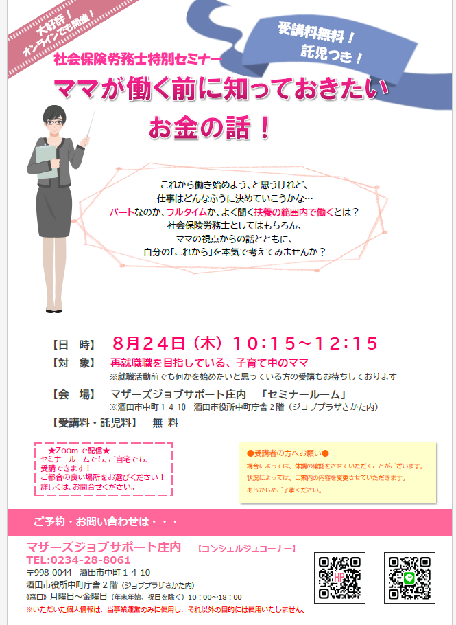 ☆ママが働く前に知っておきたいお金の話!☆ 「自分にはどんな働き方があっているのかな?」「よく聞く"扶養の範囲内で"働くって…?」プロとしてはもちろんママの視点からも語る社会保険労務士の話とともに自分の『これから』について考えてみませんか? 【日時】8月24日(木)10:15〜12:15【対象】就職を目指している子育て中のママ※就職活動前で何かを始めたい方でもOK 【会場】マザーズジョブサポート庄内 セミナールーム (酒田市中町1-4-10 酒田市役所中町庁舎2階) またはご自宅でオンライン受講(Zoom) 【料金】受講料 及び 託児料 無料 【定員】@セミナールームでの受講Aオンラインでの受講(随時受け付けております)※@の場合は託児もご利用いただけます。【託児】 ※事前登録・予約が必要です 保育ルーム開室日【水・木・金】の10:00〜16:00に登録にお越し下さい。 ※併設の保育ルームで、保育スタッフが お子さんをお預かりします。 ママは安心して受講いただけます。 ★★受講者の皆様へお願い★★場合によっては、体調の確認をさせていただくことがございます。状況によっては、ご案内の変更をさせていただきます。あらかじめご了承ください。★★ーーーーーーーーーーーー★★【駐車場について】 お車でお越しの際は、中町庁舎脇にある セントラルホテル契約駐車場をご利用ください。(『ジョブプラザさかた』と表示してあります。) ※契約駐車場が満車の場合は、 酒田市中央地下駐車場をご利用ください。 地下駐車場をご利用の方は、 無料駐車券(最大2時間)を発行いたします。 お帰りの際にコンシェルジュ窓口へお声がけください。どうぞ、お気軽にお問い合わせくださいね。◇お申込み・お問い合わせ◇マザーズジョブサポート庄内TEL:0234-28-8061メールでのお申込みはコチラ