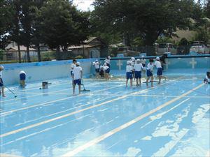5年生、6年生の働きぶりはすばらしいものでした。昨日19日にプール掃除を行いました。5・6年生児童と職員で行いました。気温が上がる中での作業でした。水を抜くと、秋から冬の間プールに落ちたたくさん落ち葉や枝が表れました。取り除き、汚れをブラシで落とすのはなかなか大変な仕事です。ぬるぬる滑る中でも一生懸命しかも楽しそうに働く子ども達はすばらしいと思いました。1時間ぐらいできれいになりました。きれいになったプールで今年の夏もたくさん泳ぐことができます。ありがとう!
