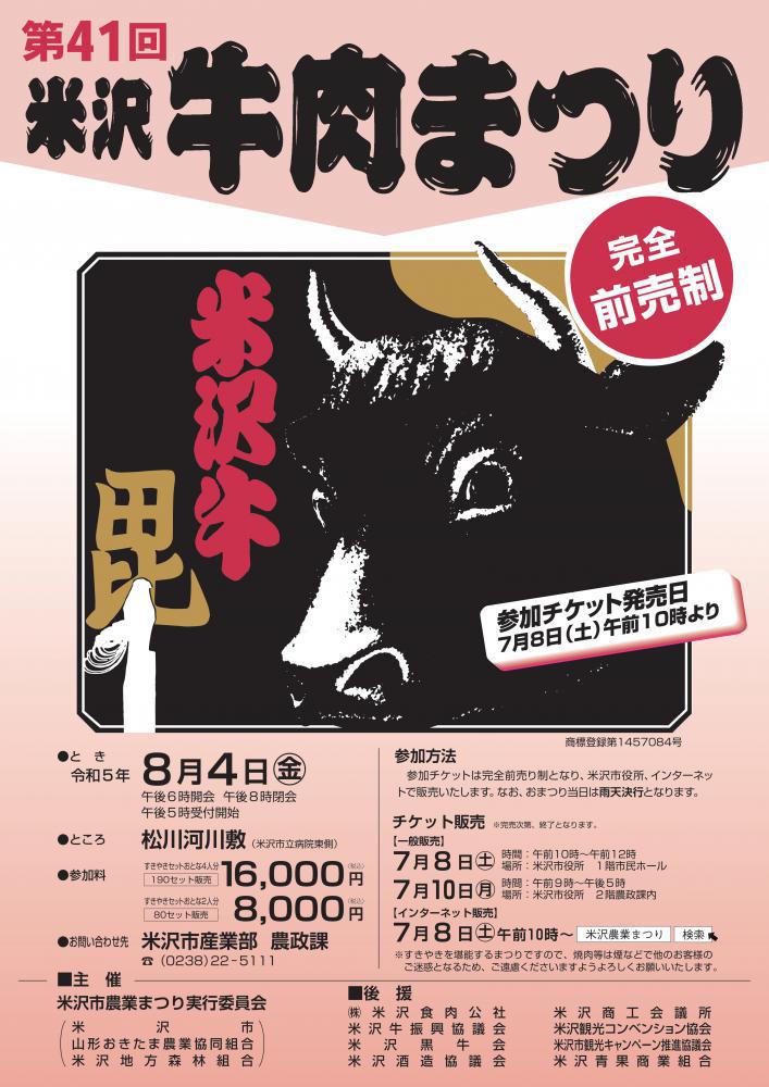 「米沢牛肉まつり」が8月4日(金)に開催されます。今回は『すき焼き』です!この機会に最高級の米沢牛をご堪能ください!! なお、参加チケットは完全前売り制ですので、下記の参加チケット購入方法をご確認ください。 【開催日時】令和5年8月4日(金)受付開始:午後5時開 会:午後6時閉 会:午後8時 【開催場所】松川河川敷(米沢市立病院東側) 【すき焼きセット内容】米沢市内の生産者が生産した最高級の米沢牛(4人分セット1kg、2人分セット500g)白菜、ネギ、糸こんにゃく、豆腐、春菊、えのき、舞茸、卵、すき焼きタレ、漬物、果物、箸、お椀なお、野菜の生育状況等によっては内容が一部変更となる場合がございます。 【参加チケット購入方法】チケット販売日時:令和5年7月8日(土)10:00〜12:00場 所:米沢市役所1階 市民ホール金 額:4人分セット16,000円、2人分セット8,000円 なお、インターネット販売についても同日10時から開始いたします。インターネット販売については、米沢の農業まつりHP(外部リンク)からご購入いただけます。 【ご購入の際の注意点】(1)市役所販売、インターネット販売共に先着順となります。(2)ご購入後の返金はいたしかねます。(3)牛肉まつり当日は、チケットとセット一式が引き換えとなりますので必ずご持参ください。 【お問い合せ】米沢牛肉まつり部会 事務局(米沢市農政課)住所:〒992-8501 米沢市金池5丁目2番25号 電話:22-5111農政課米沢牛振興室 内線4300・4301