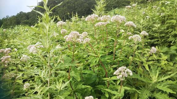 天元台高原のリフト下やゲレンデで群生してる多年草。高原の草地でよく見かけるはなです、このはなに旅する蝶”アサギマダラ”が集まるが今年はまだ見ていない、和名「四葉鵯」ヒヨドリが鳴く季節に咲いて、葉が4枚あることからこの名がついた。赤みがかったヨツバヒヨドリと白が混在する、赤も薄いのから濃いのからある、このフサフサとした花の形が、鳥の仲間のヒヨドリに似ている??とも言われますが、枯れた花は燃えやすく、『火をとる』花、から名がついたともいわれているようです。