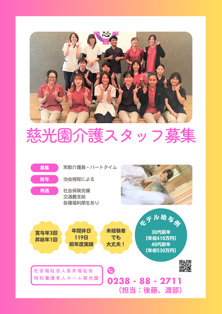 慈光園介護スタッフを募集します。介護の仕事に興味をお持ちの方は、お気軽にお問い合わせください。(受付時間:平日8時30分〜17時30分)