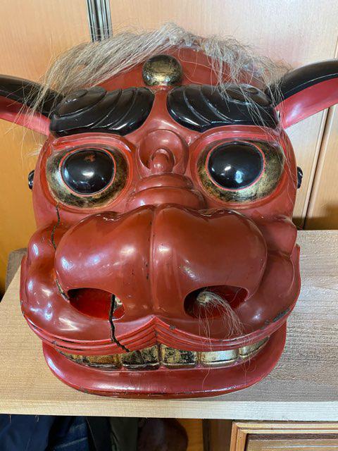 西大塚薬師堂の獅子頭 改めて見ると高橋小兵衛の作に見えてくる 額の朱のコブも特徴的