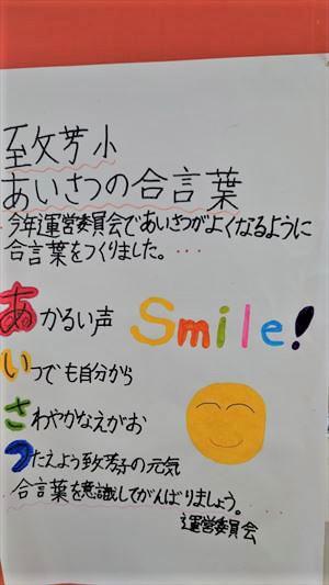 児童会の今年のスローガンはSMILE〜響くあいさつ!笑顔かがやく致芳っ子!〜です。児童会主催のあいさつリレーの取り組みが始まりました。玄関の外、玄関の中でたすきをかけた皆さんが元気でさわやかなあいさつの声をかけていました。「自分達から自分たちの学校をより良いものにしよう」という取り組みはとても素晴らしいことです。「自主・自立」の第一歩。さすが高学年の皆さんです。明日は誰にタスキがリレーされていくのか楽しみです。