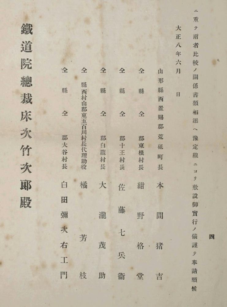 全線開通100周年を記念して書き始めたこのシリーズ。開通記念日の4月22日には間に合わなかったが、ようやく終点の荒砥駅に到着しました。どうぞご覧ください。 大正12年4月22日朝、本間猪吉は三番坂の上にいた。一番列車が鮎貝駅を出て、黒煙を噴き上げながら最上川橋梁をわたって来るのが見えた。町のあちこちから聞こえて来る「万歳、万歳」の歓声を聞きながら、4年前のことを思いだした。本間は荒砥町の出身ではなかったが、11代町長大友惣八に乞われて助役に就任した。しかしながら大友町長が就任後わずか3か月後の大正4年12月27日に急遽辞任すると、臨時代理の職に就き大正6年8月4日には町長職に就くこととなったのである。 その頃の町政の最大の課題は長井線の延伸問題であった。荒砥町における鉄道建設運動は明治44年頃から始まった。軽便鉄道長井線の計画が浮上すると同時に、梨郷から伊佐沢に抜けて荒砥までの実現を目指すものとして陳情活動を展開した。しかし「赤湯から長井まで」という鉄道院の計画は変わらなかったことから、ルートを問わずに荒砥までの延伸を要望することとなった。そして、本間が町長に就任してまもなく、大正6年12月の鉄道会議において、長井荒砥間の延長が大正8年から3か年間に敷設すべく決議されたのである。地元民にとっては10年来の悲願が達成されたとして、歓喜の声で迎えられたものだった。そして大正8年3月、鉄道院告示第2号をもって、新庄建設事務所の所管事務として「長井荒砥間」が加えられることになった。 大正8年4月、いよいよ測量が開始されることになった。がしかし、実際に測量が行われたのは最上川の左岸であった。当初は、これは単に比較のための調査であろうと信じていたが、5月12日、臨時に招集された郡内町村長会で、西置賜郡長清水徳太郎氏から重大な発表がなされた。それは、長井線の延長ルートは最上川の左岸に決定したようだ、というのである。さらに鉄道院の松本建設局長が、「鉄道院の当初の計画では最上川右岸で計画していたが、今回、政治決着により左岸を通ることになった。ついては野川と最上川に2つの橋梁を建設する予算はないので、鮎貝駅を終点として、駅名を荒砥駅とせざるを得ない。」と語ったというのである。清水郡長は「この際、郡内町村一致して鮎貝より右岸の荒砥市街地まで、更に延長の請願をしなければならない。」と言明されたのでした。これを聞いた時は、愕然となった。今までの先人の努力が水泡に帰すと思った。役場に帰ってすぐに、鉄道院総裁への請願書の作成に取り掛かったのだった。