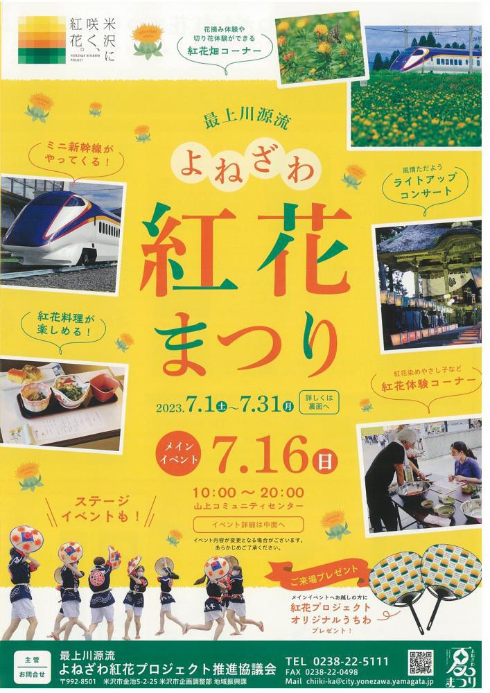 最上川源流よねざわ紅花まつり(7/1〜7/31開催)のメインイベントが7月16日(日)に山上コミュニティセンター周辺で開催されます!山上コミュニティセンターエリアでは、紅花染めなどの紅花体験コーナーや、紅花販売、ステージイベント、キッチンカーなどが楽しめ、紅花畑エリア(山形新幹線路沿い)では、紅花摘み体験や紅花フォトスポットが楽しめます!また、羽黒神社では「敬師のこころライトアップコンサート」が入場無料で開催されます。メインイベントへお越しの方に「紅花プロジェクトオリジナルうちわ」をプレゼントしますので、みなさんぜひお越しください!お待ちしております!! ●最上川源流よねざわ紅花まつり開催期間:7月1日(土)〜7月31日(月) ●最上川源流よねざわ紅花まつりメインイベント【開催日時】2023年7月16日(日) 10:00〜20:00【開催場所】山上コミュニティセンター周辺 ※詳しくはこちらをご覧ください。 【お問合せ】最上川源流よねざわ紅花プロジェクト推進協議会 (米沢市役所 地域振興課) TEL:0238-22-5111