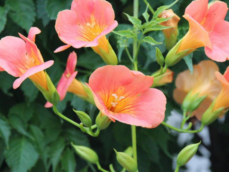 ●つる性の花木で橙色あるいは赤色の大きな花をつけ樹木や塀などの付着して咲く「ノウゼンカズラ」が梅雨空のパッとしないこの頃の気候を振り払うように咲いています 古名の「ノウセウ」「ノセウ」がなまって「ノウゼン」となったといいます その花木が他の木などに絡みついて伸びていくので「カズラ」と名がついたようです 暑い夏に太陽に負けない鮮やかな色でたくさんの花をさかせてくれる「ノウゼンカズラ」が好きです
