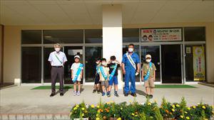 保護司会の皆さんと一緒にあいさつたすきリレーを行っています。21日からは夏の県民安全運動が行われ、十字路や学校の玄関前でも地域の皆さんに見守り運動を行っていただいております。暑い中登校してくる児童も安心して登校することができます。本当にありがとうございました。2年生にとってたすきは長すぎるので、クリップで止めて調整していました。ALTのニコさんとも英語であいさつです。