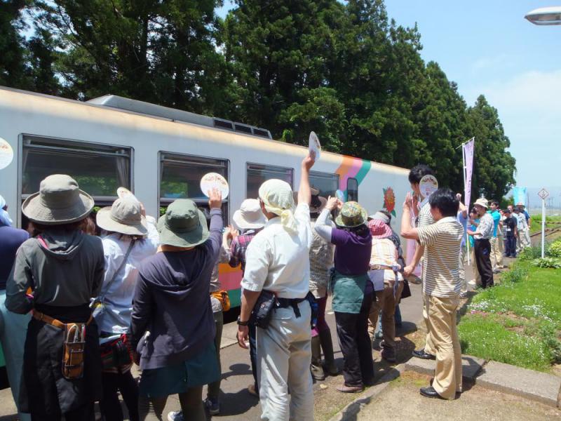 6月11日フラワ―長井線100周年おめでとうございます。初の4両編成のフラワー長井線に乗車しました。田んぼで手を振ってくださる方々の数は、左沢線のトロッコ列車より多かったです。JR越え!! 感動しました。4両編成の復路はしっかり走るのを見てました。運転手さん汽笛ありがとう。ファーッ、息子も大喜び。忘れられない日になりました。イベント時に子に鉄道帽をかぶせていただきありがとうございます。子どもにとってもうれしい素晴らしい日でした。年賀状の写真にしました。ありがとうございました。 6月17日 はれ今日は初めて羽前成田駅から乗ることができ、本当にうれしいです。また機会があったら来たいです。(サイトウ) 6月18日(日)あやめが美しく咲いています。いつもきれいにしていただきありがとうございます。 【おらだの会】写真は、2014年(平成26年)5月の長井線(赤湯〜長井間)開業100周年記念事業「スマイルプロジェクト」の時の様子です。