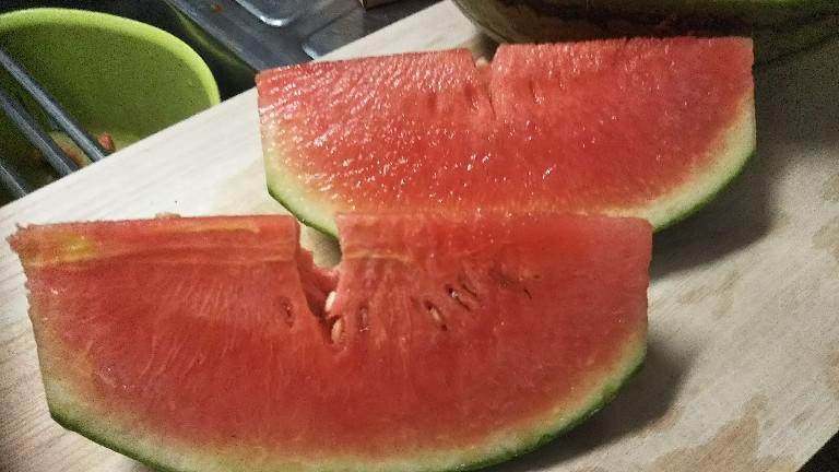 我が家のパソコンがクーラーからのしずくで壊れて、昨日ようやく新しくパソコンを交換し10日ぶりにホームページ更新です。我が家の家庭菜園スイカ、今年は6月の末に最初の一個がつつかれて、すぐにネットをかけてカラス対策し、その後は問題なしとなりましたが、そのあとハクビシンと思われる獣に次々とやられました、移住して今年7年目、初めてカラス以外にやられるようになりました。ハクビシンはカラス対策のネットごと引きちぎったりしてネットではNGですね、これは一大事とおとなりさんが罠持ってきてくれて仕掛けしてますが、今のところ警戒して捕獲できてません、スイカは我が家だけ、食われていますが、どうなってるのでしょうかね、そういえば、昨年ブドウのデラウエアが低い位置に成っていて、そろそろ収穫と思った矢先に一晩で全滅してます、このハクビシンではないかと思われますね、スイカの対策として”かご”を逆さにしてスイカにかぶせブロックを重しにしましたが、これで対策できてるようです、しかしスイカが食べれなったらキュウリにトマトもかじってるようです、今の罠が、かご状の長細いの種類なのですが、警戒して、入らないようです、かごの中の餌はバナナ、干し柿、スイカと試しましたが、罠のかごには入らないようです、種類変えて捕獲何とかしないと、このあとできそうなメロンもやられそうです、かごで保護したスイカ昨日初収穫しました。