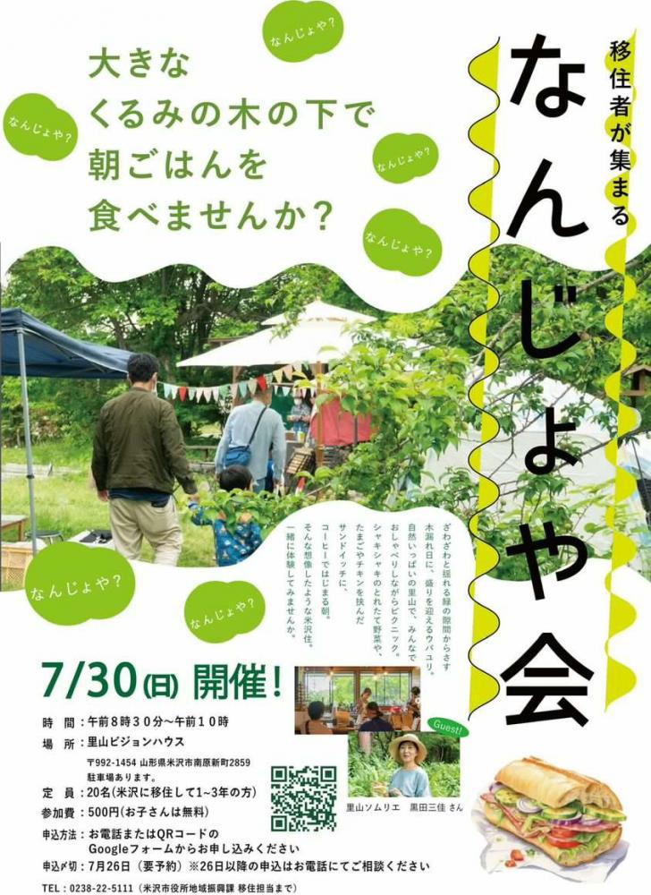 里山ソムリエ・黒田三佳さんの里山で、米沢市に住み始めた方向けのイベントを開催します。「なんじょだべ」は、置賜地方の方言で「いかがですか?」のような使われ方をしますが、フランクに質問するような意味での「なんじょや〜?」が、日常会話で登場することもあります。「米沢での生活はどう〜?」という問いかけの「なんじょや」会。ざわざわと揺れる緑のすきまからさす木漏れ日に、盛りを迎えるウバユリ。自然いっぱいの里山で、みんなでおしゃべりしながらピクニック気分の朝ごはん。シャキシャキのとれたて野菜や、たまごやチキンをはさんだサンドイッチに、コーヒーではじまる朝。色んな人に出会いたい、悩みや情報の共有がしたい、米沢をもっと知りたい方、大歓迎!想像したような米沢住を、一緒に体験してみませんか? 【日 時】2023年7月30日(日) 8:30〜10:00 【場 所】里山ビジョンハウス 〒992-1454 山形県米沢市南原新町2859 ※駐車場あり 【定 員】20名(米沢に移住して1〜3年の方) 【参加費】500円(お子さん無料) 【申込方法】お電話から TEL:0238-22-5111(米沢市役所地域振興課 移住担当)